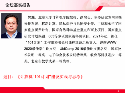 学院姜瑛教授主持特邀报告,首先由北京大学计算机学院郭耀教授进行引导发言,给与会者带来《计算机“101计划”建设实践与思考》的引导报告,郭教授的报告从“101计划”的建设规划和目标出发,着重介绍在33所工作组高校的共同努力下,“101计划”项目开展过程中在核心课程体系建设、优秀教材建设、课堂观察与师资培训等教学改革任务中取得的阶段性成果,并探讨未来的工作思路与计划,以及对计算机专业教育教学改革的一些思考。