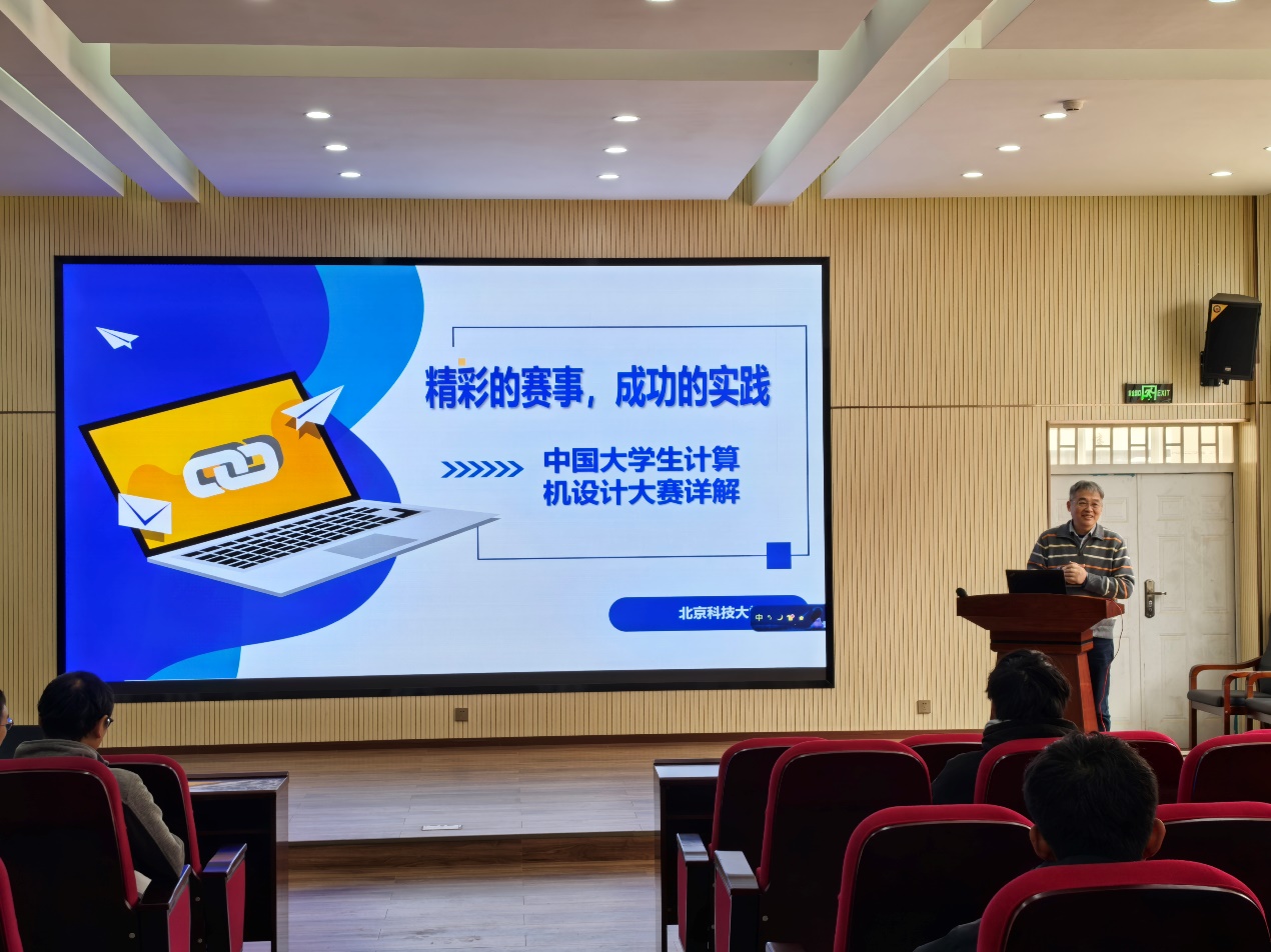 于3月21日上午举办专题培训,特邀北京科技大学计算机与通信工程学院教授、大赛资深评委姚琳教授担任主讲。本次专题培训题目为“精彩的赛事,成功的实践——中国大学生计算机设计大赛详解”,培训在计算机重点实验室二楼报告厅举行,吸引全校各学院近60名参赛学生和指导教师参与。