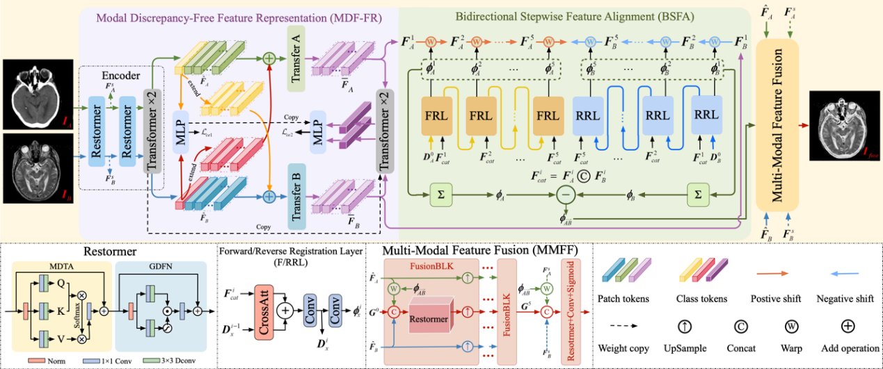 论文简介:如果能在统一的处理框架内,采用单阶段的方式同时实现未配准多模态医学图像的对齐和融合,不仅能实现双任务的协同促进将还有助于降低模型的复杂性。然而,要实现这一模型的设计往往面临着用于融合的特征和用于对齐的特征两者之间不可协调的难题。具体而言,特征对齐要求对应特征具有一致性,而特征融合则要求对应特征具有互补性。为应对这一挑战,本文提出了一种Bidirectional Stepwise Feature Alignment (BSFA)的未对齐医学图像融合方法。为消除模态差异对跨模态特征匹配产生负面影响,我们在BSFA中嵌入了Modal Discrepancy-Free Feature Representation (MDF-FR)特征表述方法。MDF-FR对输入的图像引入了模态特征表示头(Modal Feature Representation Head, MFRH)来集成输入图像的全局信息,通过注入当前图像的头信息到其他模态的图像中,有效降低了模态差异对特征对齐的影响,同时保护了不同图像所携带的互补信息。在特征对齐方面, BSFA基于两点间向量的路径无关性,提出了双向逐步对齐的变形场预测策略,解决了单步对齐跨度大,变形场预测不准确的难题。最后Multi-Modal Feature Fusion块通过将预测到的变形场应用于多模态特征上,实现了输入图像在特征级上的对齐和融合。在多个数据集上的实验结果证明了本文方法的有效性以及相对于已有方法的优越性。