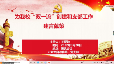 研自一党支部于线上开展“我为学校‘双一流’创建和支部工作建言献策”党日主题活动,全面提升党支部工作质量,为我校双一流建设提供强力支撑。本次会议由王爱坤主持。