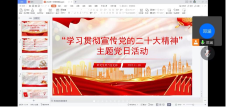 学习宣传贯彻党的二十大精神,是当前和今后一个时期的首要政治任务。党的二十大报告举旗定向、主题鲜明,思想深邃、内涵丰富,是激励全党全国人民奋进新征程、夺取新胜利的宣言书、动员令。研究生第六党支部于2022年11月18日开展党日活动,通过线上分享、小组交流等多层次、多形式、全方位的学习方式,组织全体党员全面学习贯彻党的二十大精神。