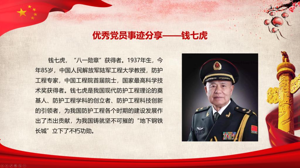 然后,袁有为同志分享了一位优秀党员——钱七虎同志的事迹,从钱七虎同志身上学习到不怕艰难、不怕挫折、不怕干扰的优秀党员品质,把追求理想永不停歇的状态,视为最大的幸福,正是有无数如钱七虎老先生般,无私奉献,科学报国的英雄,我们的祖国才愈来愈强大。