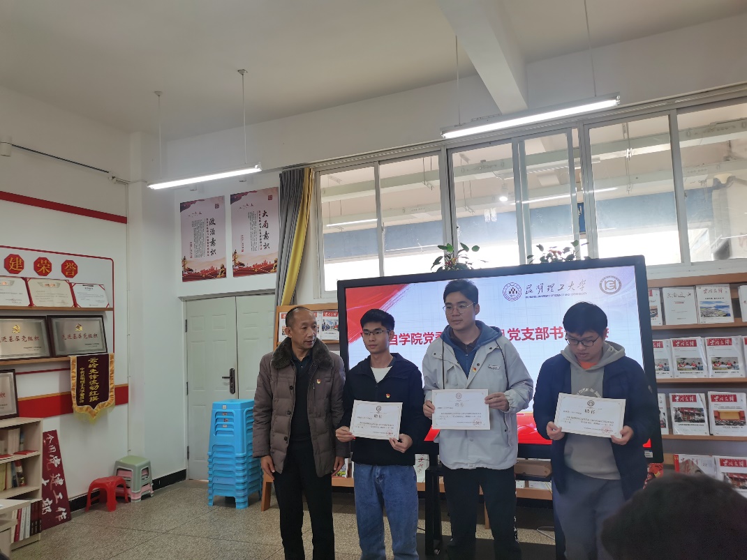 其次,由组织员邹恒同志对最近的工作进行一个提醒,首先是说明了1月份的主题党日活动主题是学习习近平总书记新年贺词以及对支部新一年的工作进行相应的规划;其次对涉及到支部班子有调整的党支部作出要求,要求各支部将工作交接完善,确保后续工作的顺利开展,同时要求各支部再次检查支部党员材料并及时进行整改补充;最后提醒各支部及时将述职PPT发送至党委邮箱,并希望新的一年大家能够结合支部特色与专业将支部活动做出特色与亮点。随后,由兼职组织员娄世猛同志通报了12月份智慧党建完成情况,并对假期期间的智慧党建工作作出安排与提醒。