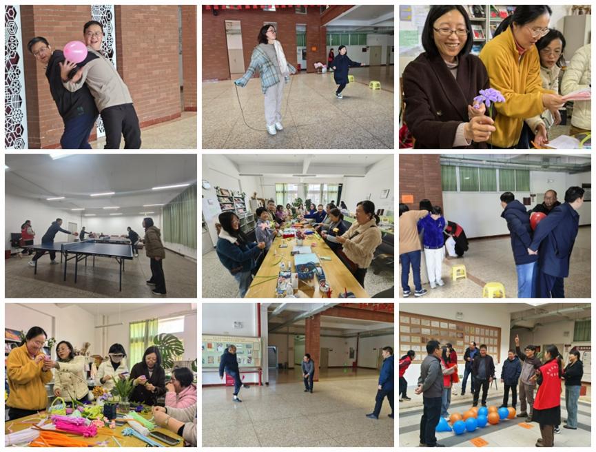 此外,还有“争分夺秒”跳绳比赛(1分钟计数),“身轻如燕”踢毽子比赛,这两项活动充分展示了教职工们的活力与风采;“巧手慧心”用扭扭棒制作花束活动,则让教职工们在动手制作中感受到了创造的乐趣与美好;“心有灵犀”一人比划一人猜词活动,更是将现场气氛推向了高潮,教职工们在欢声笑语中体验了默契与智慧的碰撞。