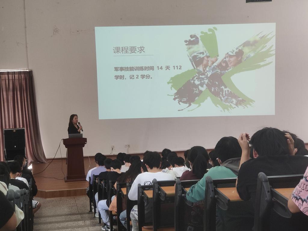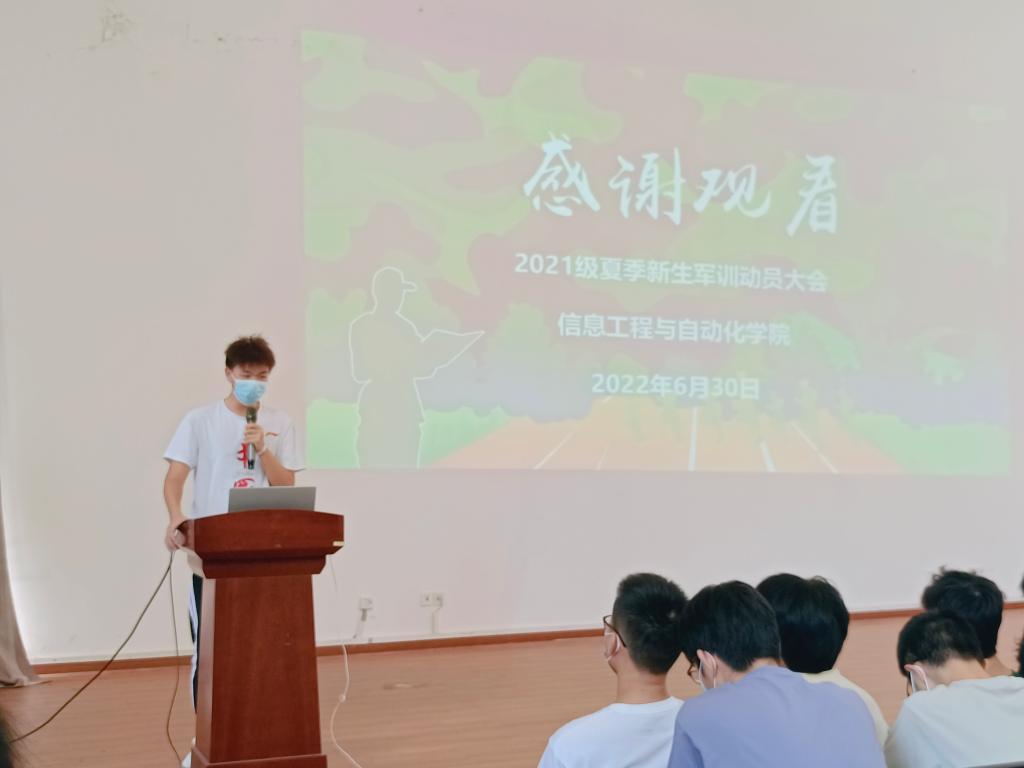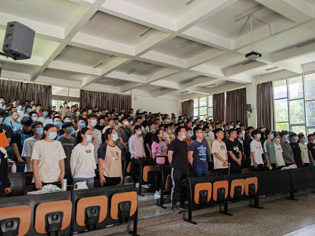 军训动员大会。出席动员大会的有学院党委副书记周鹭老师、军训带队辅导员、班主任老师,2021级全体参训同学,大会由刘冰老师主持。会议伊始,全体师生起立奏唱国歌。