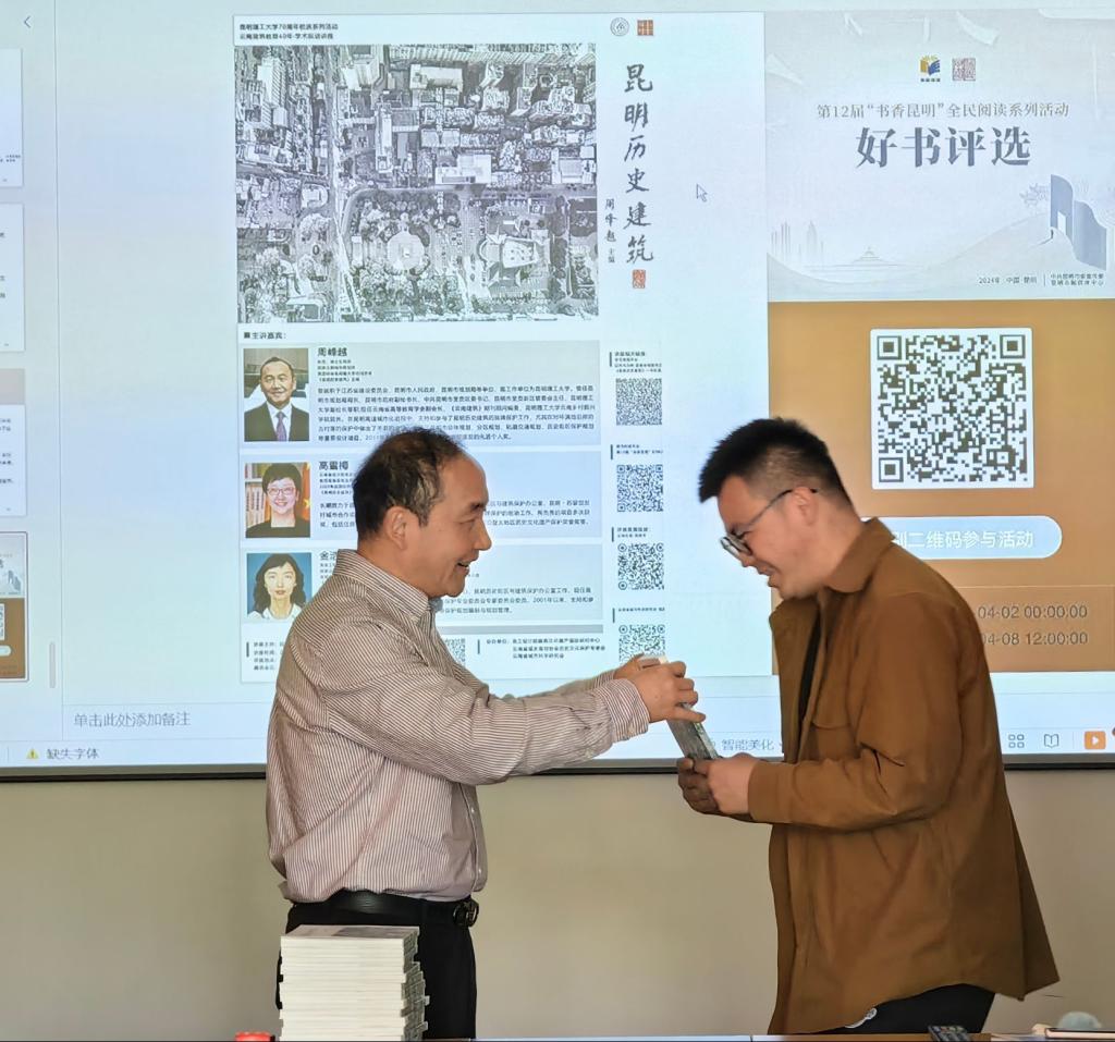 周峰越教授围绕《昆明历史建筑》开展学术讲座,介绍了自昆明建城以来保存至今的历史建筑,这些充满活力的建筑与空间,不仅承载了历史的记忆,还向我们展示了昆明城千年以来的人居环境的变迁。最后,周峰越讲授亲自将图书《昆明历史建筑》捐赠到学生手中,并分享了自己的阅读心得和体会。他强调阅读对于个人成长和未来发展的重要性,鼓励学生们多读书、读好书,通过阅读不断提升自己。