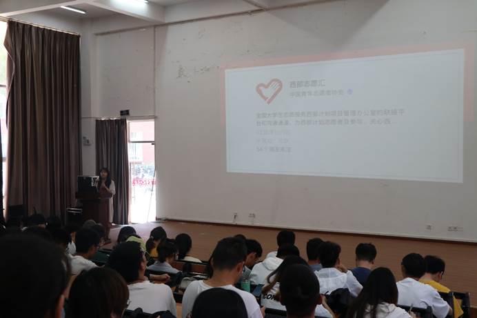 万松老师首先结合学校特点及需求,围绕西部计划的意义、服务内容、政策支持、选拔要求、报名审核和注意事项六大方面为同学们做了宣讲。随后,万老师着重强调了西部计划进度安排和注册报名相关注意事项,鼓励同学们积极报名参加。会上,同学们学习了西部计划典型故事《我是“花果山里的山大王”》,切实感受大学生志愿服务西部计划的意义及面临的挑战。最后,万老师就同学们关心的“选拔方式”进行了答疑。