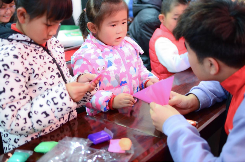 活动过程中,志愿者们身穿红马甲,分头行动。通过观看“大手牵小手,奇妙手工行”为主题的宣传视频,充分调动孩子们对制作趣味手工的兴趣。志愿者们在与社区小朋友和家长进行折纸、捏橡皮泥等手工艺术活动中,鼓励小朋友们积极上台展示自己的作品,提高了小朋友的动手、沟通能力和想象力,同时传递了温暖。