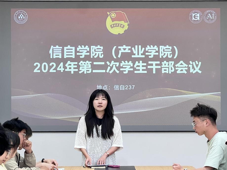 (人工智能产业学院)团委在信自237报告厅召开2024年第二次学生干部工作会议。本次会议由学院团委负责人万松主持,辅导员陈玉婷、苏蕊以及团委学生会、艺术团、学生社团、青协全体学生干部参会。